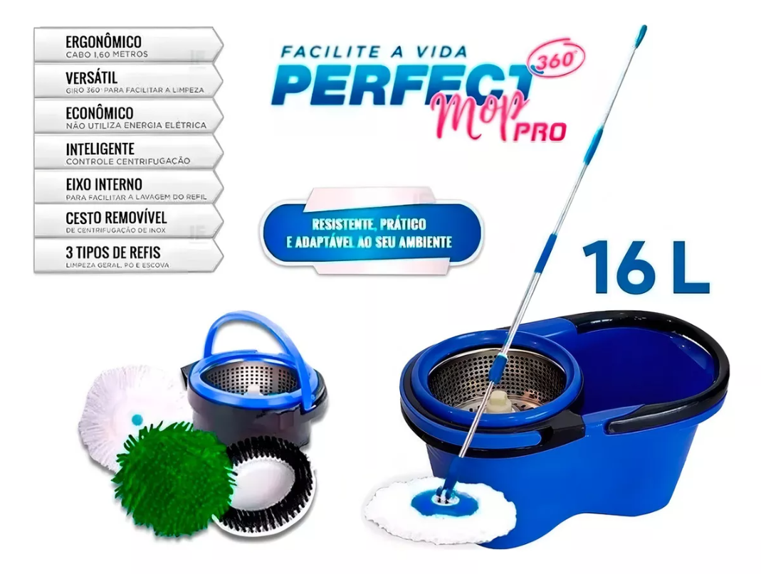 Descubra a eficiência e a praticidade do Perfect Mop Pro, que transforma a limpeza de ambientes em uma atividade simples e rápida. Ideal para residências, apartamentos, escritórios e áreas externas. O Perfect Mop Pro elimina poeira, absorve líquidos sem deixar marcas e mantém suas mãos limpas e longe da sujeira.Principais Características:Versatilidade: Utilize em diversos ambientes para uma limpeza impecável.Alta absorção: As fibras de microfibra removem sujeiras e líquidos eficientemente.Ergonomia: Cabo de 1,60 metros para uma postura correta e confortável durante o uso.Itens Inclusos:1 Refil de microfibra para esfregão1 Refil para limpeza a seco1 Refil para limpeza pesada1 Balde com sistema de centrifugação 360° de inox inoxidável1 Cabo completo para o mopVantagens:Durabilidade: Balde com cesto de inox resistente e cabo ergonômico.Alcance: Cabo extenso para limpar locais de difícil acesso.Eficiência: Microfibra que absorve rapidamente líquidos e sujeiras sem danificar superfícies.Especificações Técnicas:Dimensões: Altura: 25,5 cm | Largura: 27 cm | Comprimento: 46 cmCabo: Altura ajustável até 1,60 metros com auxílio da travaCapacidade do Balde: Total: 16 litros | Uso efetivo: 8 litrosCom o Perfect Mop Pro, você terá um aliado poderoso que garante uma limpeza eficaz e sem esforço. Experimente e surpreenda-se com a qualidade e a praticidade que ele oferece!